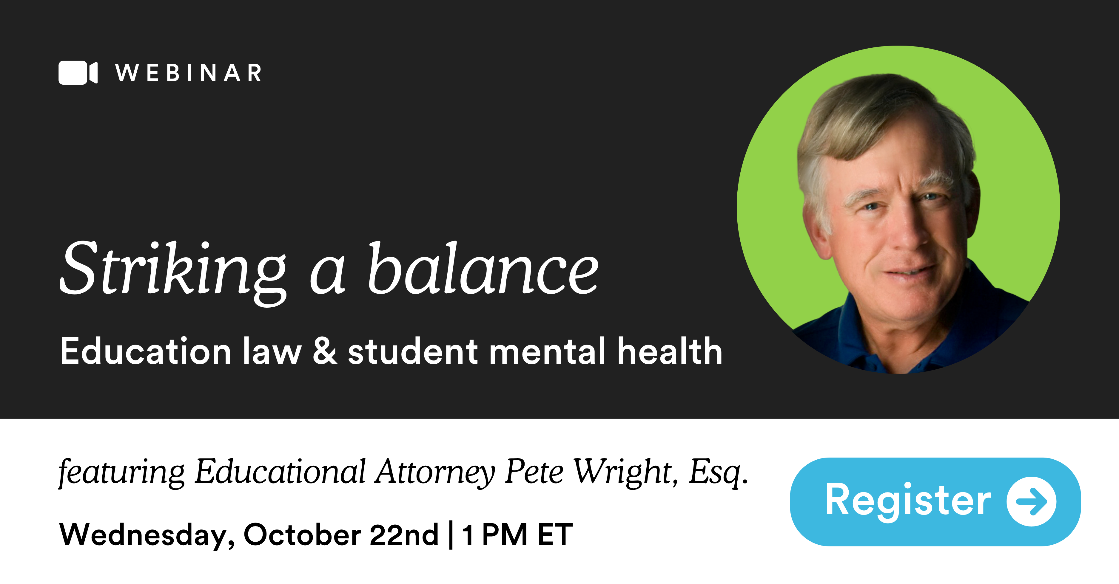 Join us for a webinar with educational attorney Pete Wright as we explore how schools can navigate the complex legal landscape surrounding student mental health. You’ll gain practical guidance on: demystifying the legal language that shapes student mental health support, navigating the laws and policies that shape your school’s responsibilities and protections, partnering with families to move from conflict to collaboration. Drawing on decades of advocacy and his landmark Supreme Court case, Pete Wright will help you approach student mental health with confidence, legal awareness, and a shared commitment to student wellbeing. Whether you support students directly or lead from an administrative role, you’ll walk away with the tools to balance compassion and compliance.